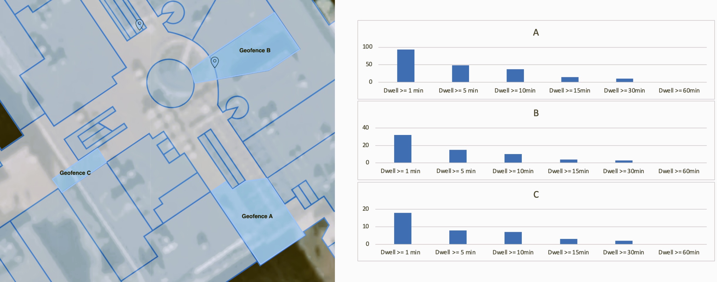 IndoorAtlas Dwell Time analyzes your positioning data to calculate how long visitors stay in specific areas (geofences) inside your venue.